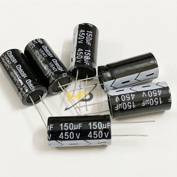 Như chúng ta đã biết tụ hóa 150uF 450V là tụ phân cực, có dung môi là một lớp hóa chất. Tụ hóa 450V 150uF là tụ có hình trụ, trị số được ghi trực tiếp trên thân tụ. Sau trị số điện dung bao giờ cũng có giá trị điện áp, điện áp ghi trên tụ chính là điện áp cực đại mà tụ có thể chịu được, vượt qua giá trị này thì lớp cách điện sẽ bị đánh thủng , trong thực tế ta phải lắp tụ có trị số áp cao gấp khoảng 1,5 lần điện áp của mạch điện.